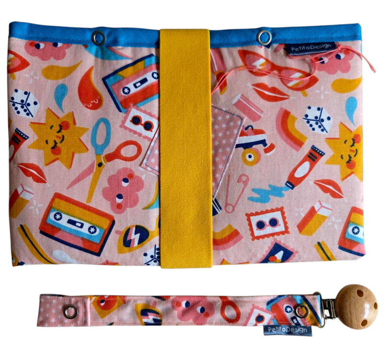 Roze met creaspullen, cassettes, zonnebril, ... in katoen en roze met witte sterretjes in geplastificeerd katoen.