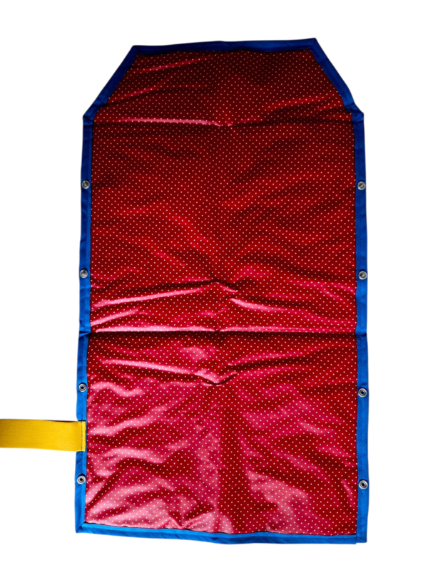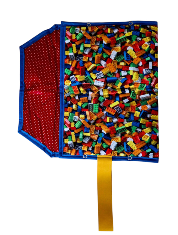 Lego heeft kleurrijke legoblokjes in katoen aan de buitenkant en rood met witte stippen in geplastificeerd katoen aan de binnenkant. Gele elastiek