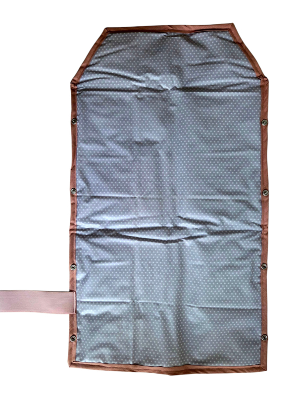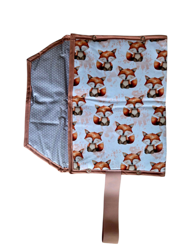 Vosjes heeft wit met vosjes aan de buitenkant en grijs met witte sterretjes in geplastificeerd katoen aan de binnenkant. Roze elastiek