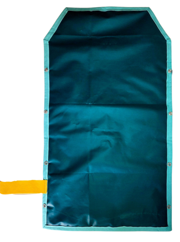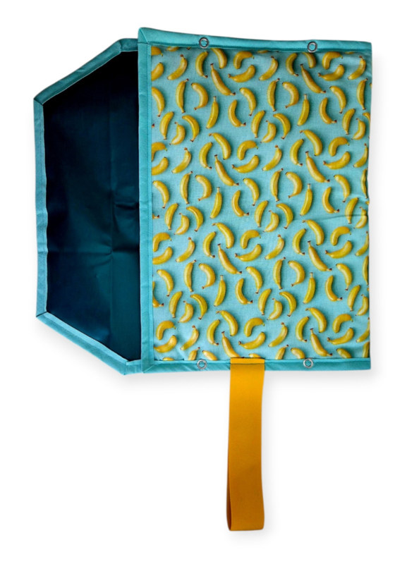 Bananas heeft mintgroen met bananen aan de buitenkant en petrol in geplastificeerd katoen aan de binnenkant. Gele elastiek