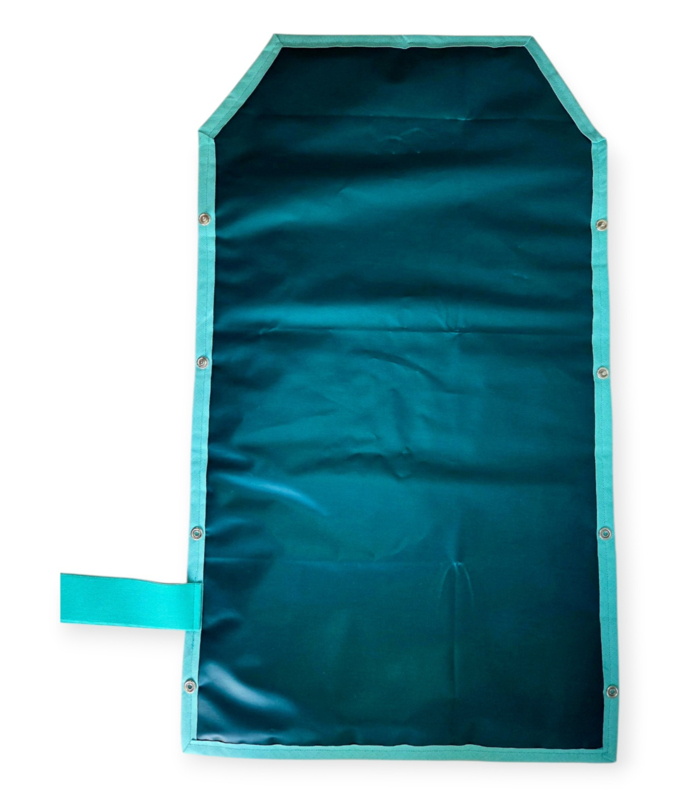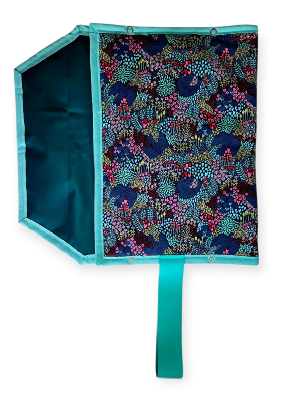 Bloemenweelde heeft allemaal bloemetjes en plantjes in mintgroen, roze katoen aan de buitenkant en petrol in geplastificeerd katoen aan de binnenkant. Mintgroene elastiek