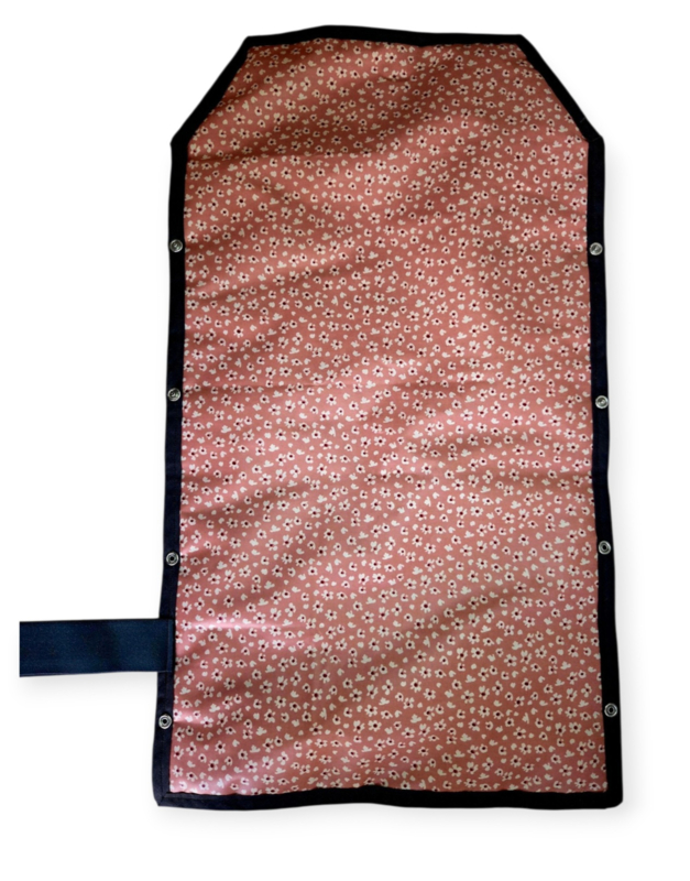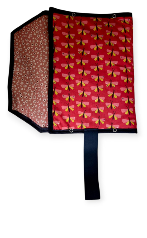Vlindertjes heeft rood met roze gele vlindertjes aan de buitenkant en roze bloemetjes in geplastificeerd katoen aan de binnenkant. Grijze elastiek