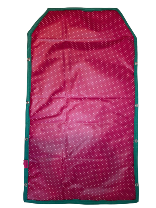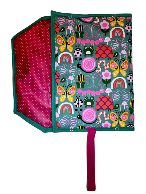 Rupsje Vlinder heeft kleurrijke rupsjes, vlinders en andere dieren aan de buitenkant en fushia met witte stipjes in geplastificeerd katoen aan de binnenkant. Roze elastiek