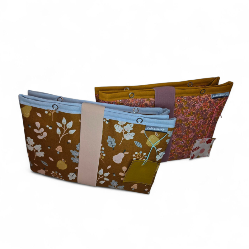 Appel & Peer heeft bruin met roze oeer en gele appel en blaadjes aan de buitenkant en oker geel met in geplastificeerd katoen aan de binnenkant. Baby roze elastiek