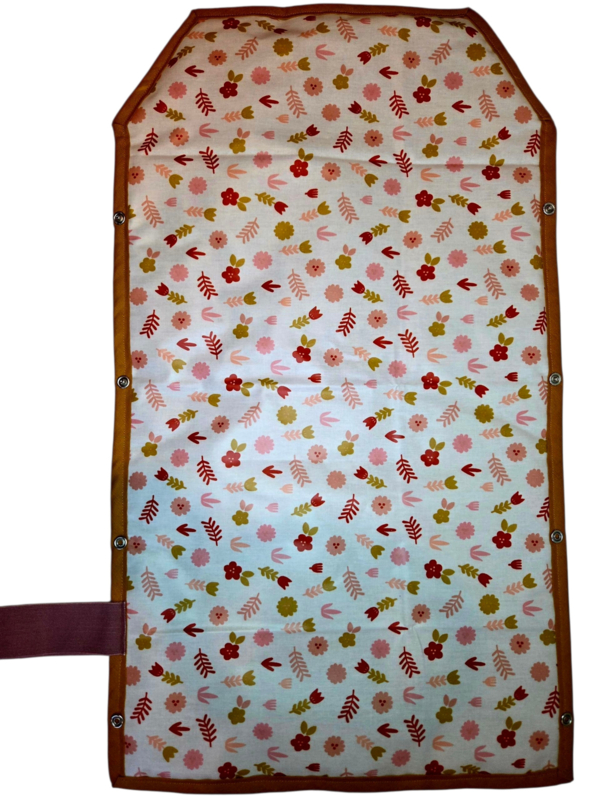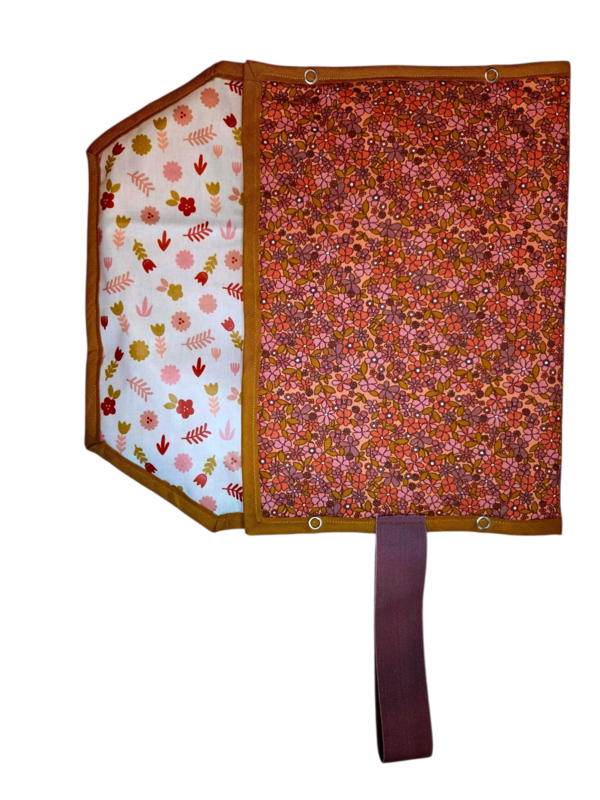 Des Fleurs heeft roze met bloemetjes aan de buitenkant en wit met bloemen in geplastificeerd katoen aan de binnenkant. Paarse elastiek
