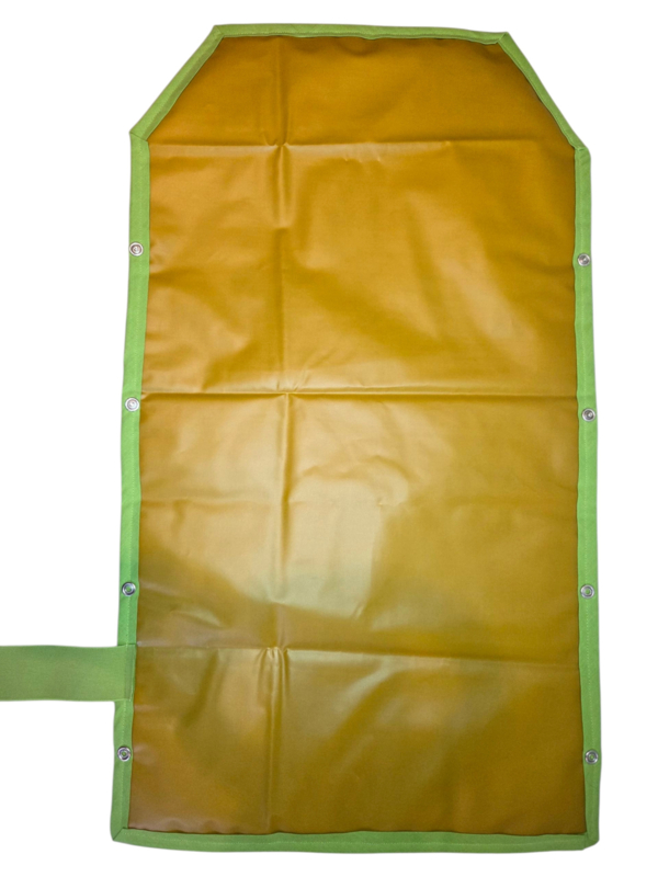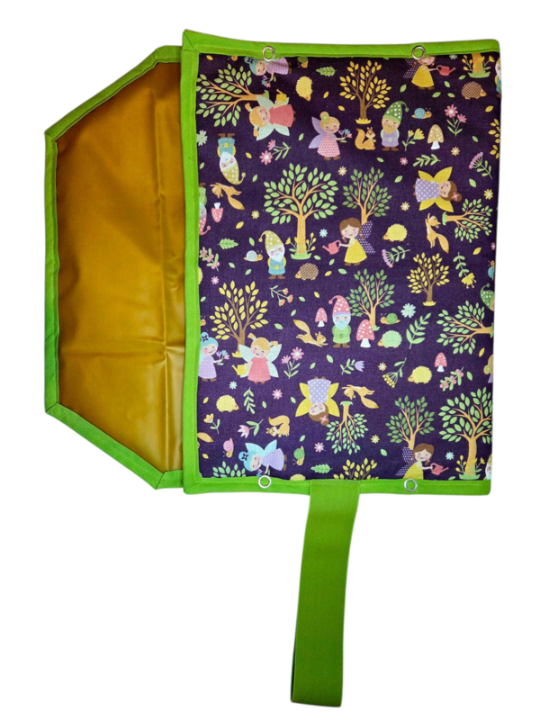 Engektjes en Kabouters heeft paars met kleurrijke engeltjes en kabouters aan de buitenkant en okergeel in geplastificeerd katoen aan de binnenkant. Groene elastiek