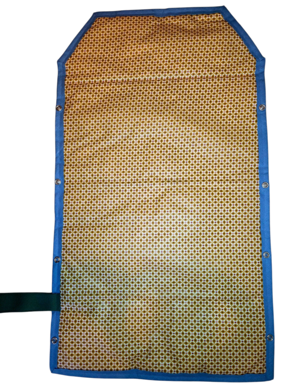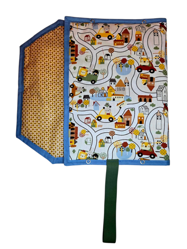 Onderweg heeft een dorp met wegen en diertjes aan de buitenkant en okdergeel met stipjes in geplastificeerd katoen aan de binnenkant. Groene elastiek