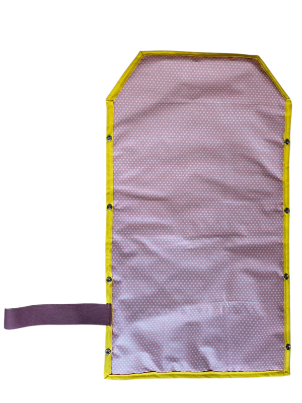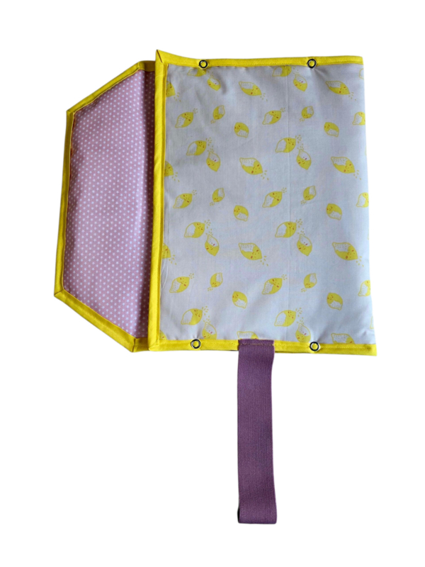 Citroentje heeft citroentjes aan de buitenkant en roos met witte sterretjes in geplastificeerd katoen aan de binnenkant. Roos-paarse elastiek