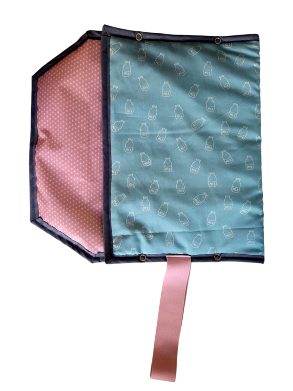 Milk heeft melkflessen aan de buitenkant en roze met witte sterretjes in geplastificeerd katoen aan de binnenkant. Roze elastiek