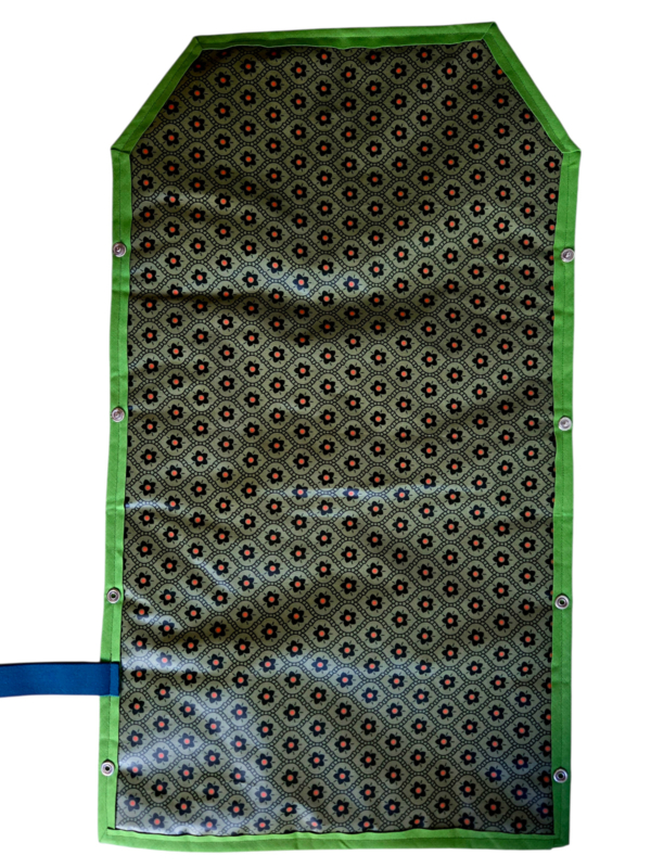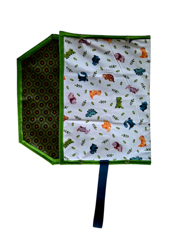 Baby Dino heeft kleine gekleurde dino's aan de buitenkant en groen met bloemtejes in geplastificeerd katoen aan de binnenkant. Petrol elastiek