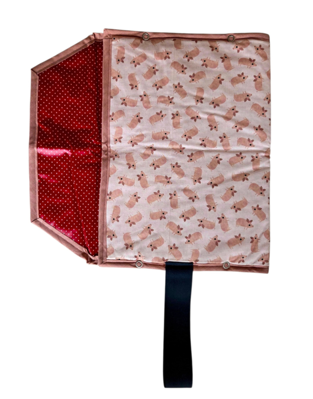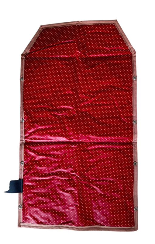 Biggetje heeft roze met biggetjes in katoen aan de buitenkant en rood met witte stippen in geplastificeerd katoen aan de binnenkant. Grijze elastiek