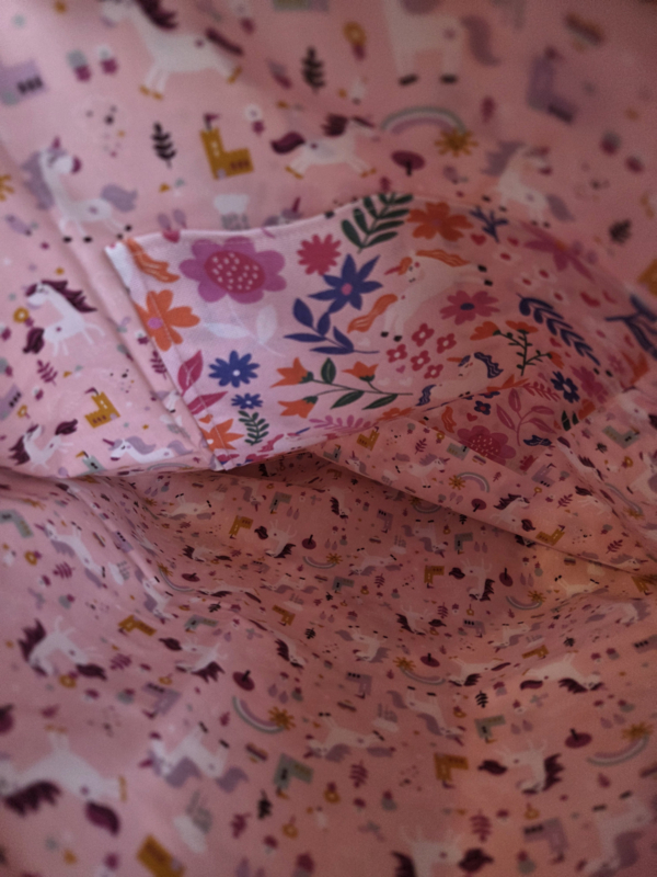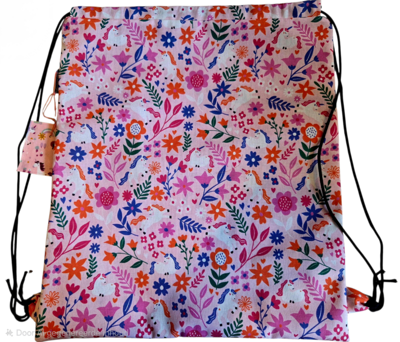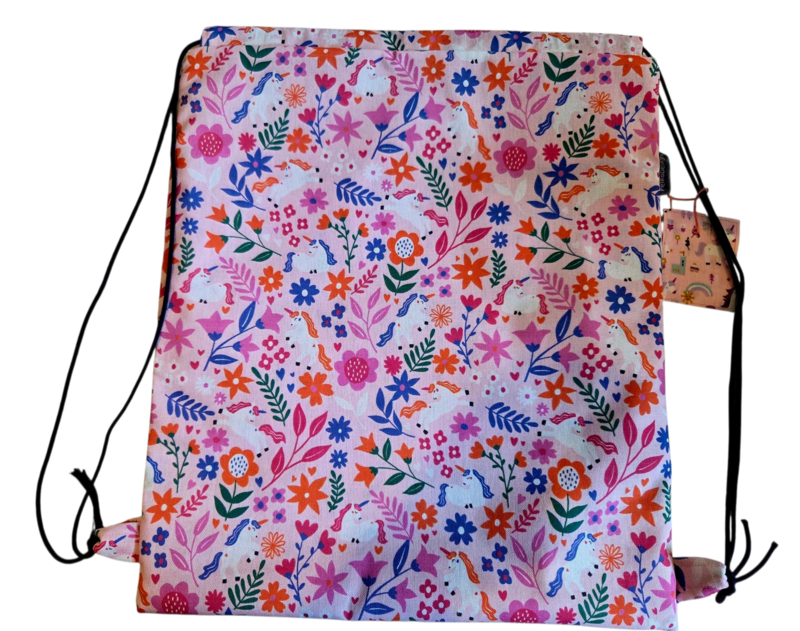 Petitotas Eenhoorn heeft roze met eenhoorns en bloemen aan de buitenkant en eenhoorns en regenbogen geplastificeerd katoen aan de binnenkant. Donker blauw koord.