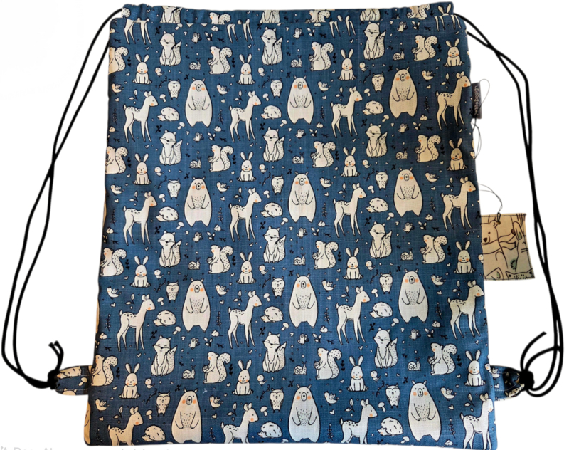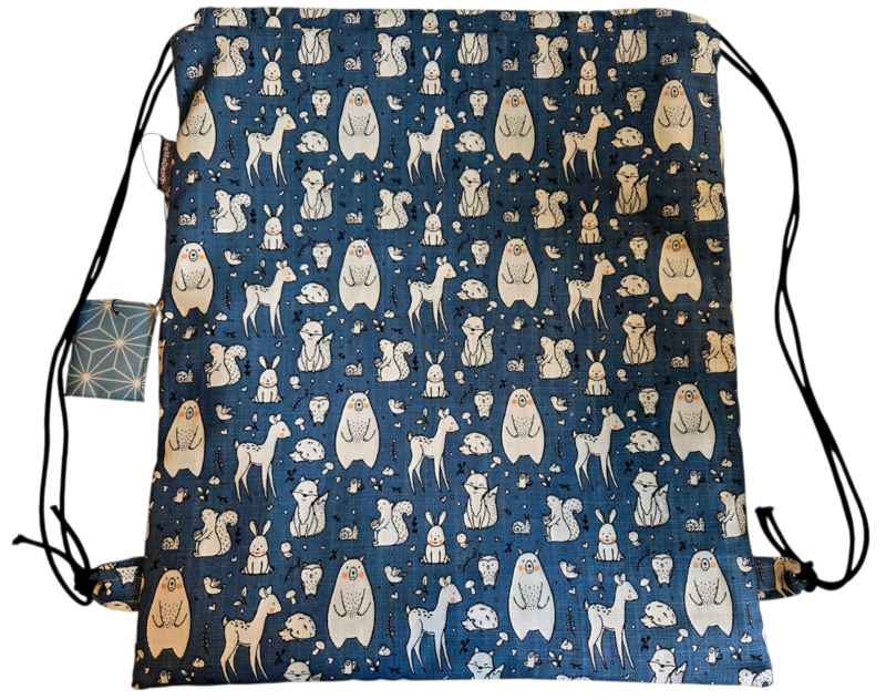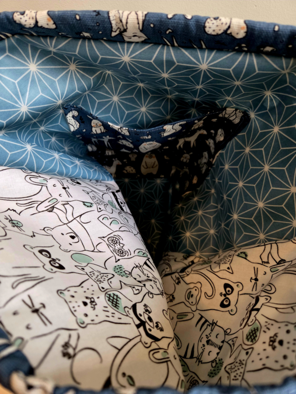 Petitotas Diertjes heeft blauw met witte beren, konijen, hertjes, vosjes, ... aan de buitenkant en blauw met witte lijnen aan de ene kant en wit met diertjes aan de andere kant geplastificeerd katoen aan de binnenkant. Zwart koord.