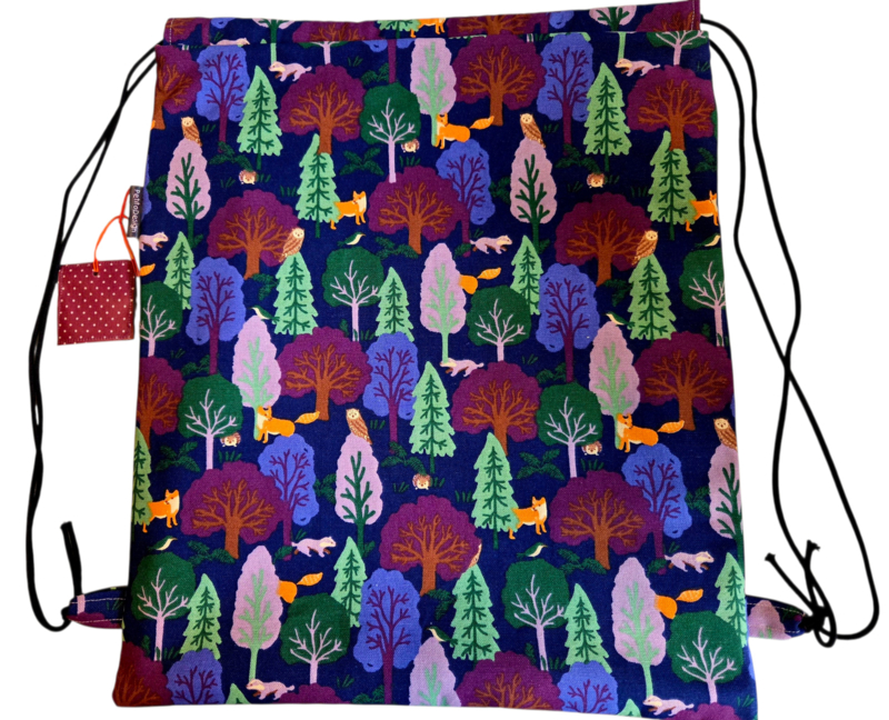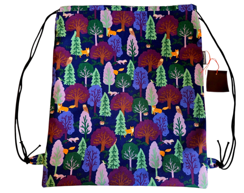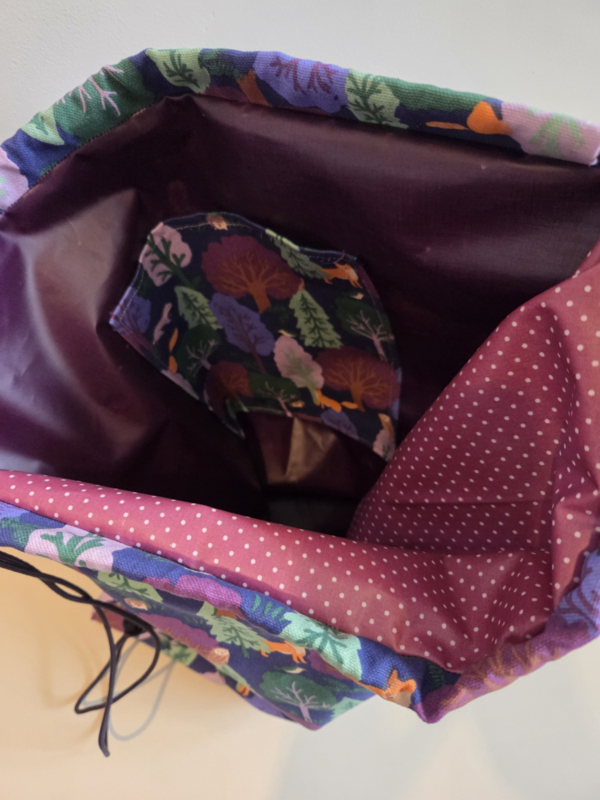 Petitotas Vos in bos heeft kleurijke bomen met vosjes aan de buitenkant en paars met witte stippen aan de ene kant en donker paars aan de andere kant geplastificeerd katoen aan de binnenkant. Donker blauw koord.