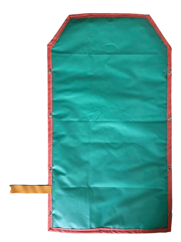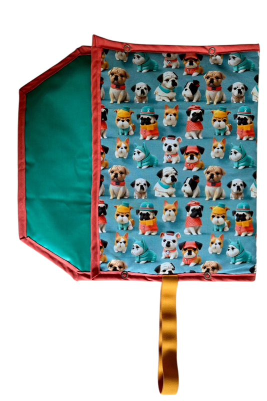 Funny Dogs heeft mintgroen/blauw met grappig geklede hondjes aan de buitenkant en mintgroen in geplastificeerd katoen aan de binnenkant. Okergele elastiek